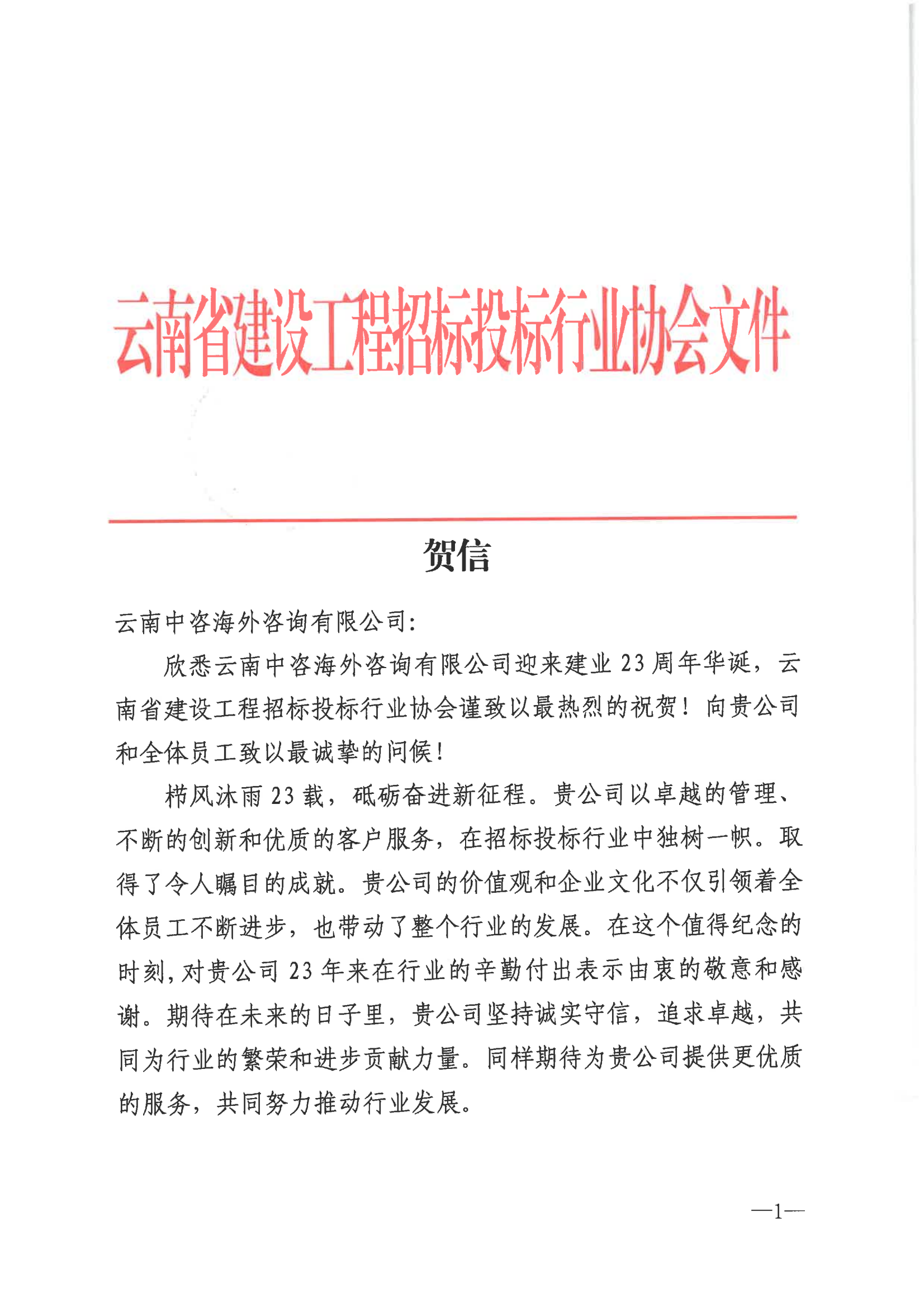 值此春節(jié)來臨之際,恰逢我公司成立23年,喜獲云南省建設(shè)工程招標(biāo)投標(biāo)行業(yè)協(xié)會賀信。這封賀信,承載著行業(yè)對我們多年拼搏奮進(jìn)的高度認(rèn)可,飽含著對我們深耕前行的熱忱鼓勵(lì)。我們將秉持初心,以更高品質(zhì)的服務(wù)和產(chǎn)品回饋社會,攜手共創(chuàng)美好未來!